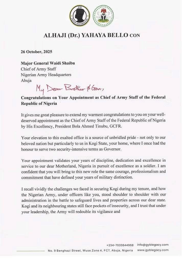 Former Kogi State Governor Yahaya Bello has come under intense criticism after posting — and later deleting — a congratulatory letter to the newly appointed Chief of Army Staff (Lt-Gen Waidi Shaibu) written on a letterhead with the official Kogi State Government logo, even though he no longer holds office.