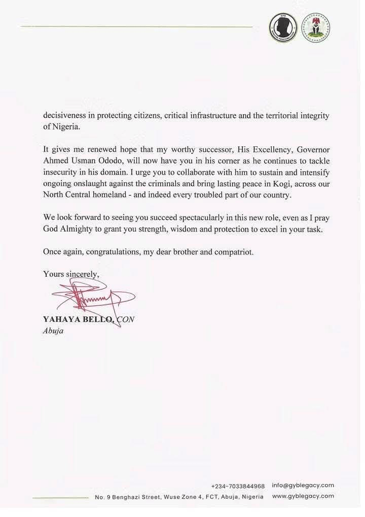 In the letter, Bello congratulated the new Army Chief but included a line that quickly drew attention: “It gives me renewed hope that my worthy successor, His Excellency Governor Ahmed Usman Ododo, will now have you in his corner as he continues to tackle insecurity in his domain.”