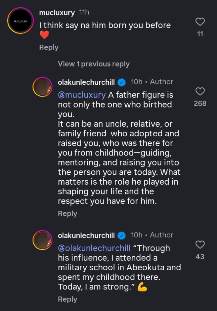 Responding to the comment, he explained that a father figure is not necessarily the person who gave birth to you, but one who plays a significant role in raising, guiding, and mentoring someone while growing up.