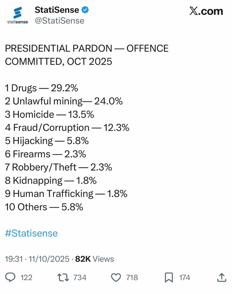 StatiSense’s post analyzes the offenses of 175 convicts granted clemency by Nigerian President Bola Tinubu on October 11, 2025, with drug-related crimes topping the list at 29.2% and unlawful mining at 24%, based on the official government release.