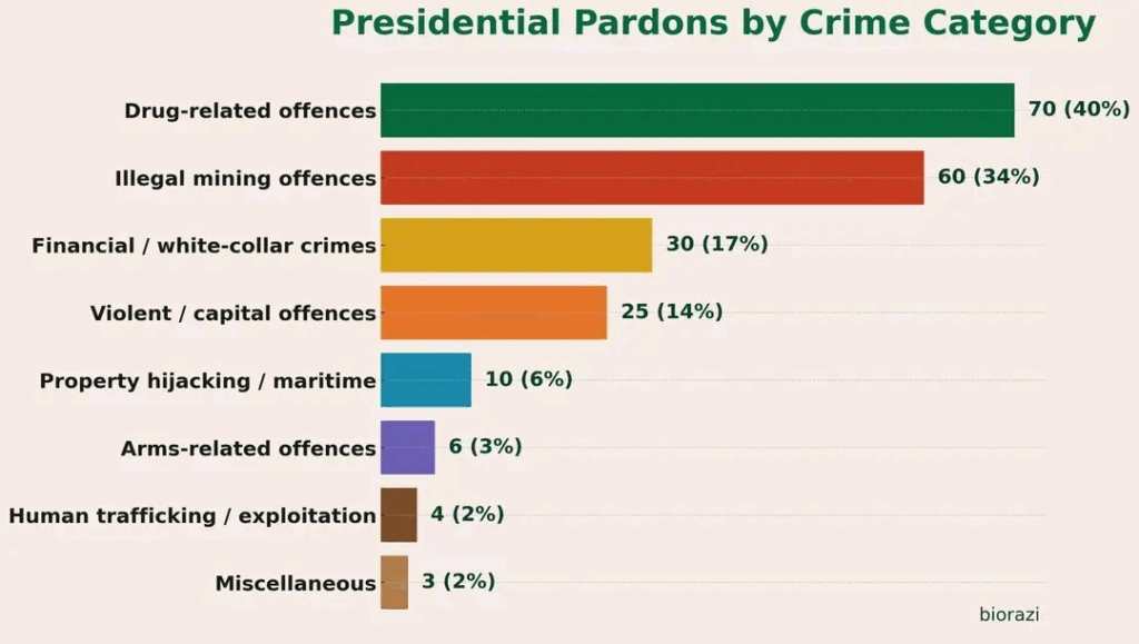 The breakdown, derived from public records, includes sentence reductions for many drug traffickers and full pardons for historical cases like Ken Saro-Wiwa, aiming to address prison overcrowding and past injustices.