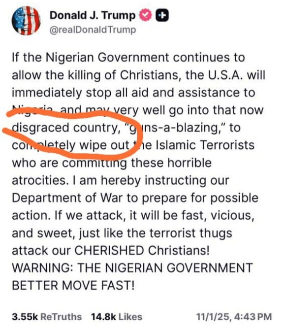 Trump had in a statement on Saturday warned that if the Nigerian government failed to tackle the alleged genocide against Christians, the US will “immediately stop all aids and assistance to Nigeria and may very well go into that now disgraced country”, to wipe out the terrorists allegedly perpetrating the religious persecution.